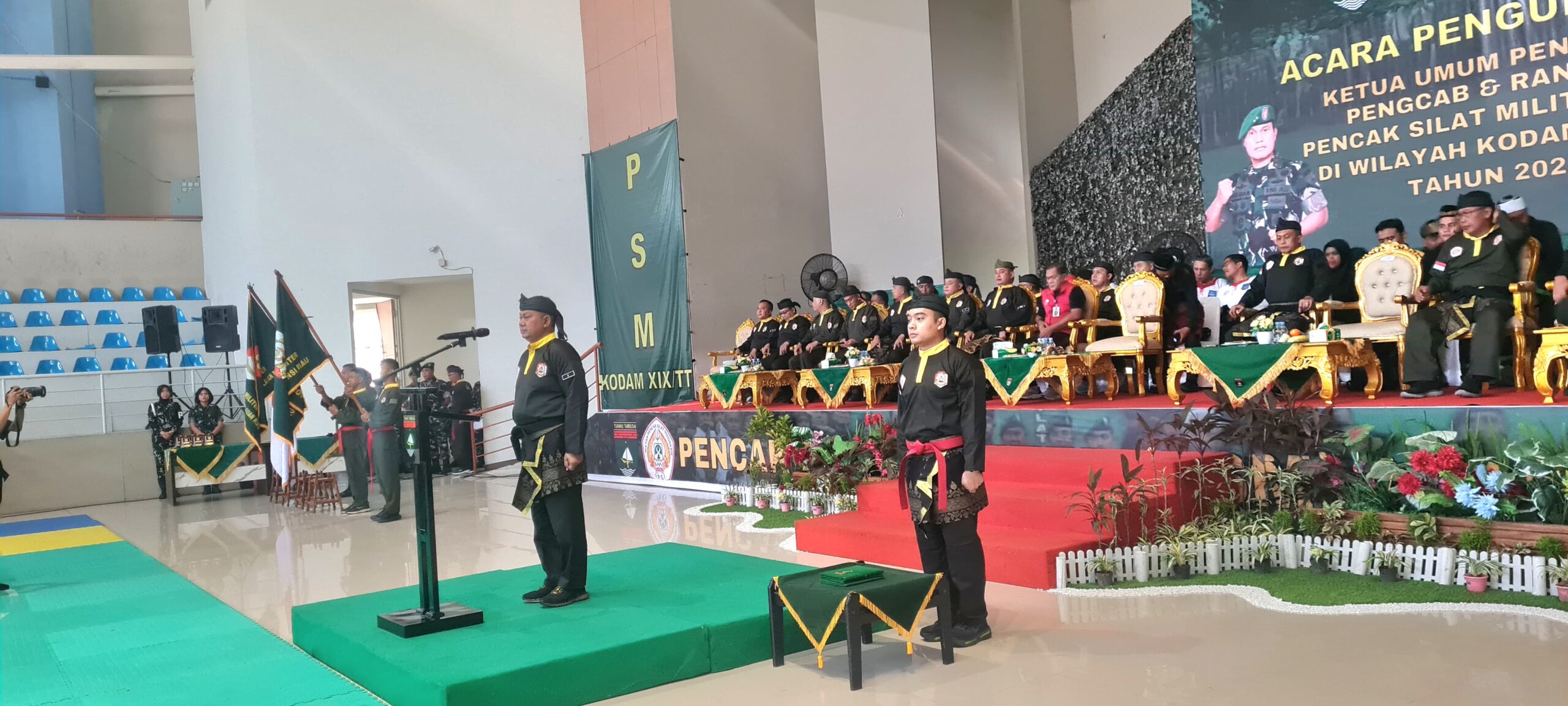 PEKANBARU || Pengukuhan kepengurusan Pencak Silat Militer (PSM) wilayah Kodam XIX/Tuanku Tambusai dipimpin langsung oleh Kasdam XIX/Tuanku Tambusai Brigjen TNI Rudi Hermawan, S.E., M.M. dalam prosesi yang berlangsung khidmat dan penuh semangat. Kegiatan ini turut dihadiri Sesdisjasad Kolonel Inf Ade Eka Putra, S.I.P., M.M. selaku perwakilan pengurus pusat PSM, para Pejabat Utama (PJU) Kodam, serta para Komandan Satuan (Dansat) jajaran Kodam XIX/Tuanku Tambusai.