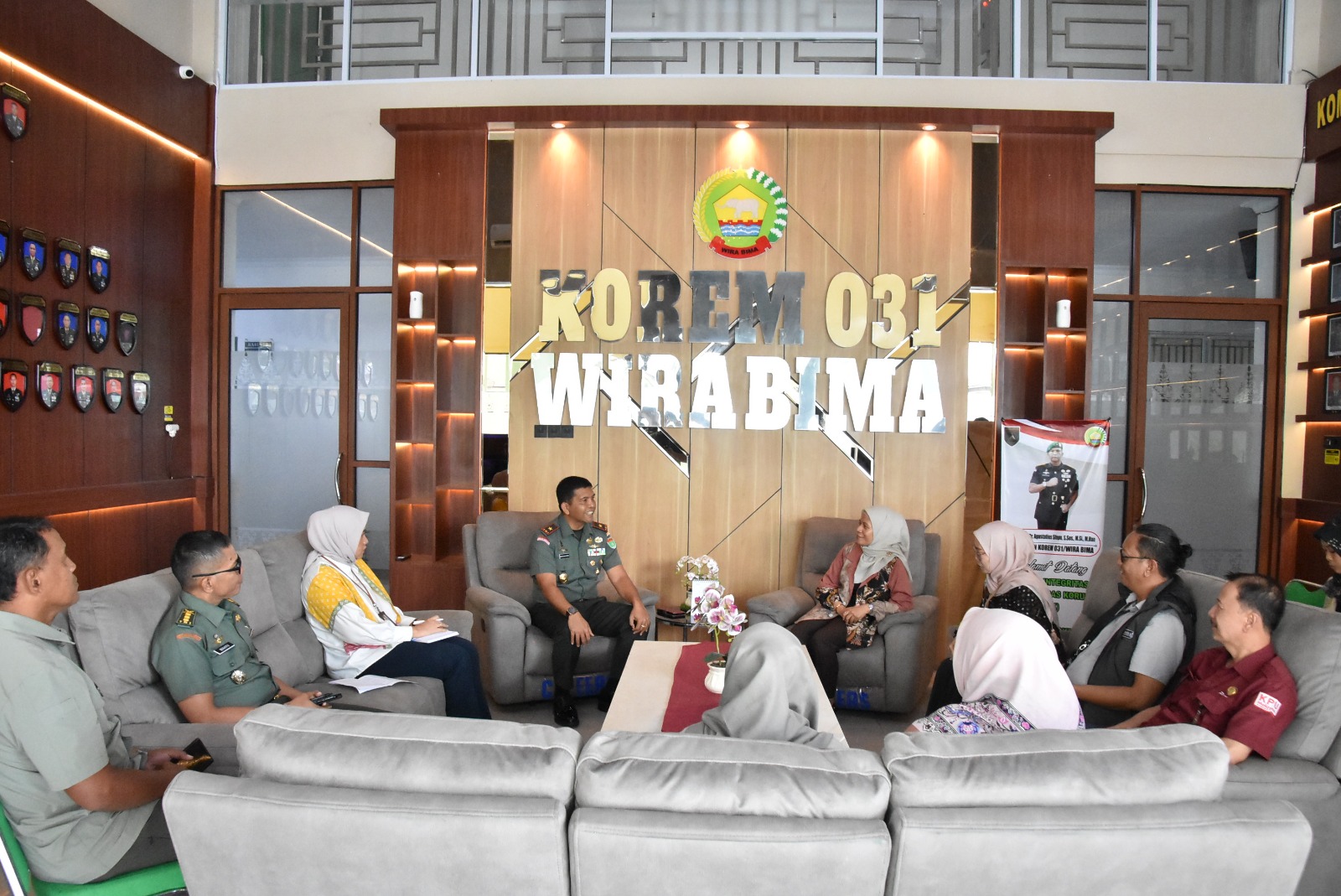 Rombongan diterima langsung oleh Danrem 031/Wira Bima, Brigjen TNI Dr. Agustatius Sitepu, S.Sos., M.Si., M.Han., yang dalam kesempatan tersebut turut didampingi oleh Kepala Seksi Teritorial Kasrem 031/WB dan Kepala Penerangan Korem 031/WB.